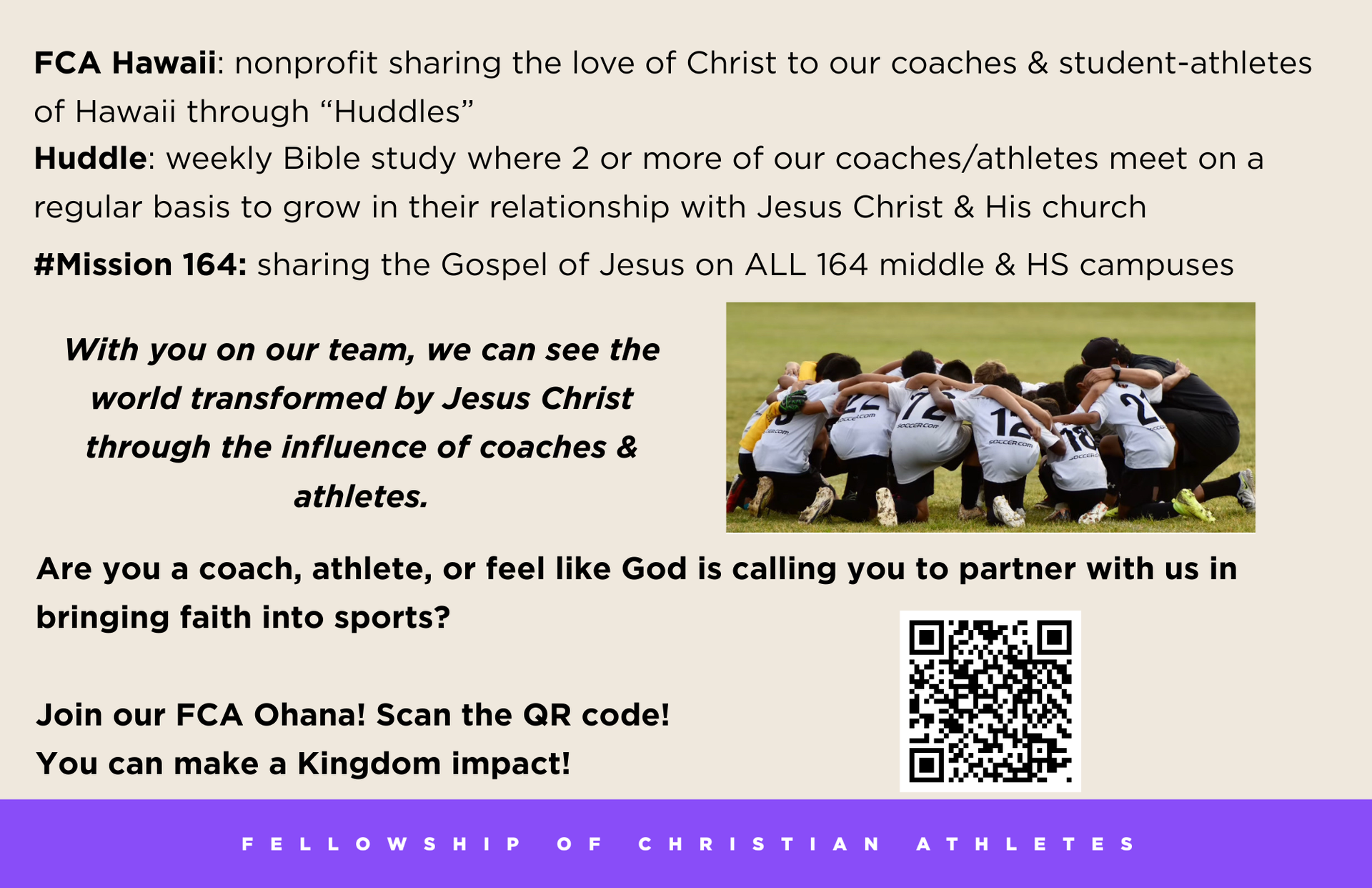 FCA's mission is to lead every coach and athlete into a growing relationship with Jesus Christ and His church. The E3 Discipleship Strategy engages coaches and athletes with the Good News, equips them with God's Word, and empowers them to live out the Great Commission as disciple makers, generation after generation.